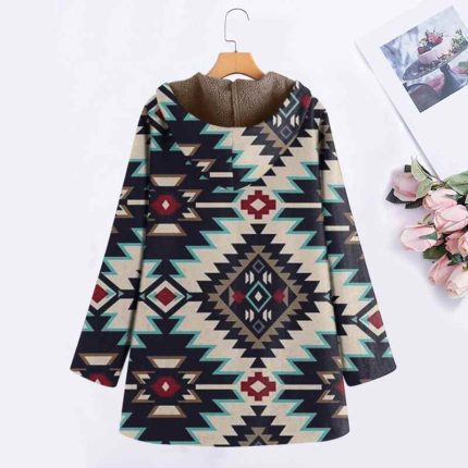 Women Winter Warm Outwear Floral Print Long Sleeve Hooded Coats Vintage Fluffy Fleece Zipper Coat Loose Female Pocket Jacket Top