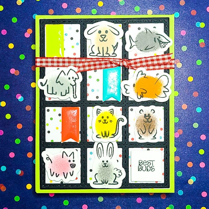 Stamps include: dog, cat bear, penguin, little girl, little boy, mouse, fish, bunny, elephant, panda bear, shark, football, and pig