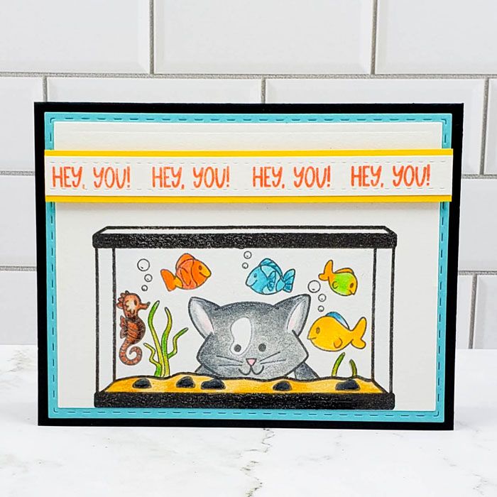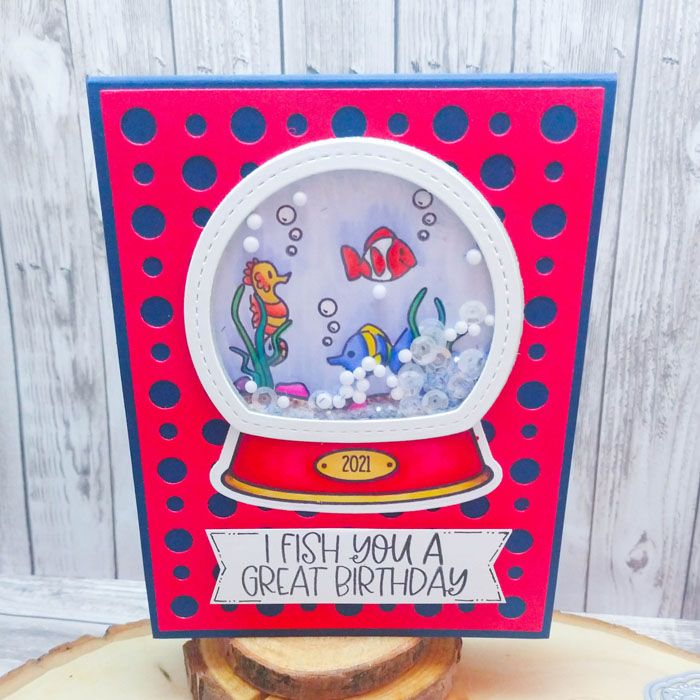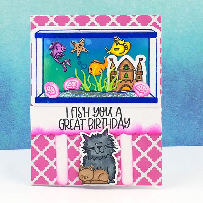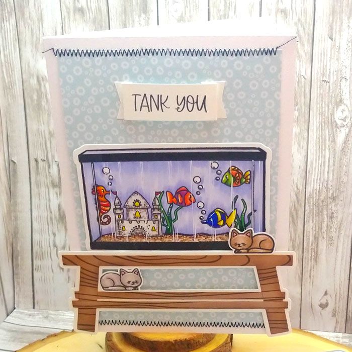 This clear stamp set includes 14 stamps on a 4×6 inch sheet. The fish tank stamp measures approximately 4 x 2.5 inches.